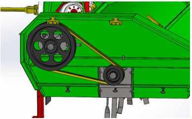 拖拉机通过传动轴将动力传至变速箱,变速箱通过左右两边的传动轴将动力传至两边的大皮带轮,大皮带轮通过皮带传至小皮带轮,小皮带轮带动杀秧轴进行杀秧。